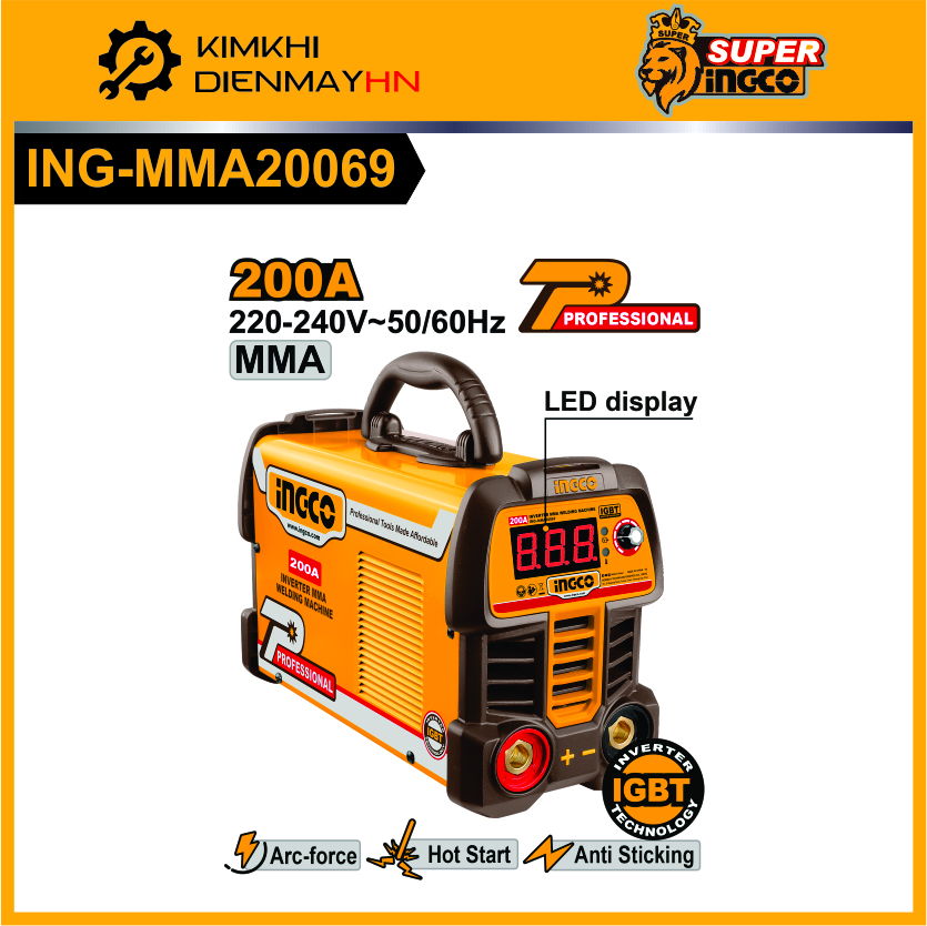 Máy hàn điện tử 200A INGCO ING-MMA20069 là dòng máy hàn ứng dụng công nghệ biến tần IGBT tiên tiến, giúp tiết kiệm điện năng và đảm bảo mối hàn mịn, đẹp. Thiết kế nhỏ gọn, dễ dàng di chuyển, phù hợp cho cả thợ chuyên nghiệp lẫn gia đình. Máy có khả năng hàn liên tục với công suất cao, hoạt động ổn định, hỗ trợ nhiều tính năng hiện đại như chống dính que hàn, khởi động nóng và Arc-force, giúp việc hàn dễ dàng và hiệu quả hơn.